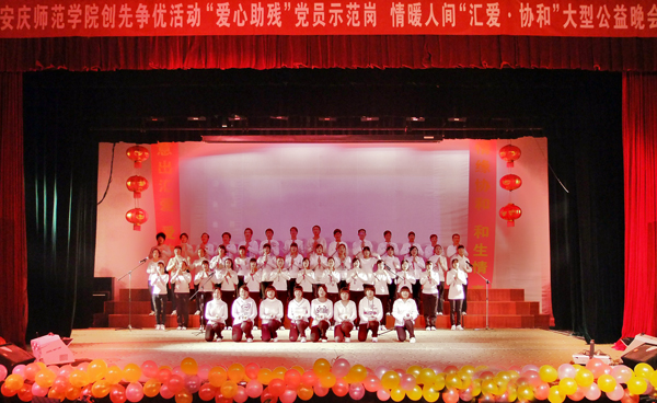 12月8日晚,由beat365官网文学院主办、学生处和校团委协办的“安庆师范学院创先争优活动‘爱心助残’党员示范岗——‘情暖人间,汇爱•协和’大型公益晚会”在龙山校区音乐厅隆重举行。校党委副书记、院长朱士群,党委副书记、纪委书记殷红亲临现场与400余名学生一起观看了晚会。