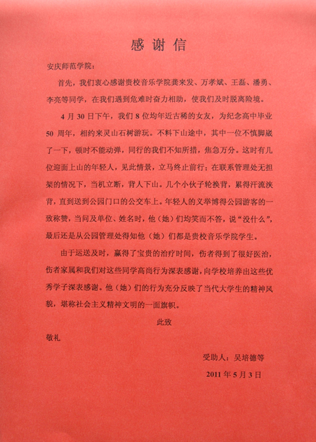 音乐学院这些同学的行为充分反映了当代大学生的精神风貌,堪称社会主义精神文明的一面旗帜。为此,受伤的老同志家属特地给学校发来了感谢信,向学校培养出这些品德高尚的同学表示感谢。(宣传部)