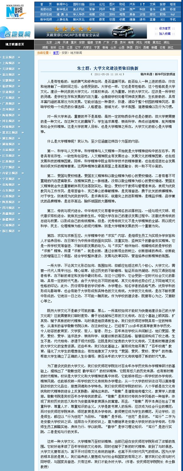 编者按:大学文化、大学精神是事关大学建设的根本性、战略性问题,一直受到高等教育专家学者的关注。日前,院长朱士群教授撰写了《大学文化建设要依旧焕新》的文章,对大学文化、大学精神等问题进行了深入而独到的思考,指出了大学文化建设的价值指向、大学文化的基本内涵、大学文化建设和大学精神培育的基本路径和应有态度,对高校的大学文化建设具有前瞻性和引领性。文章受到媒体的广泛关注,新华网、搜狐网、中国网、中国日报网、大学信息网、新民网等多家重要媒体纷纷转载。