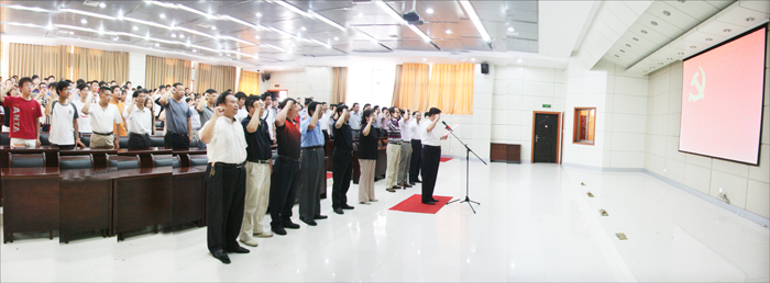 党委书记何小祥面对鲜红的党旗,高举右拳,一字一句而又铿锵有力地说,“我志愿加入中国共产党,拥护党的纲领,遵守党的章程……”在他的身后,副院长时新中,党委副书记、纪委书记殷红等校领导和300余名师生党员代表,齐声宣誓。
