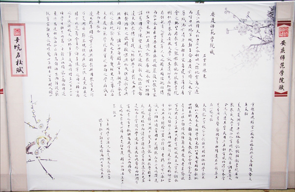 定稿后的《安庆师范学院赋》内容丰富,既清晰地写出了学校一百一十余年的办学历史源流,又书出了学校欣欣向荣的发展现貌、特色和亮点;赋文感情充沛,没有堆砌辞藻,没有刻意用典,文字通俗晓畅,语言典雅清新。《安庆师范学院赋》上报教育厅后,受到安徽教育宣传中心有关负责同志的高度好评,认为是最为出色的作品之一。(党委宣传部)