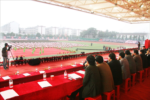 当天上午,庐江二中彩旗招展,欢迎省内名校来宾的横幅悬挂在校园各处。鲜花,歌声,掌声,以及数千名学生整齐靓丽的衣装,将塑胶运动场扮成一个欢庆的海洋。在这里举行的是《吾皖名校赋》优秀作品集首发式暨优秀书法作品展览仪式,beat365官网校报编辑部主任陈东和石云孙老教授撰写的《安庆师范学院赋》在这次活动上精彩亮相。