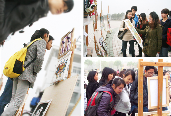 活动于当天早晨8点40开始,作品刚一摆好,就吸引了过往的师生。“我早上乘的是8点半的校车,到这里还不到9点,这里已经围满了老师和学生。”美术学院党总支副书记鲍硕来告诉记者,“举办困难生优秀作品义卖活动,一方面是为了塑造经济困难生自助自强的信心。他们通过自己辛勤劳动创作的优秀作品,能卖出去,能被老师、同学们接受,这是对自己劳动的认可,是自我价值的体现,说明自己可以通过勤奋努力脱贫、自强。这是我们举办这个活动的第一个目的”。