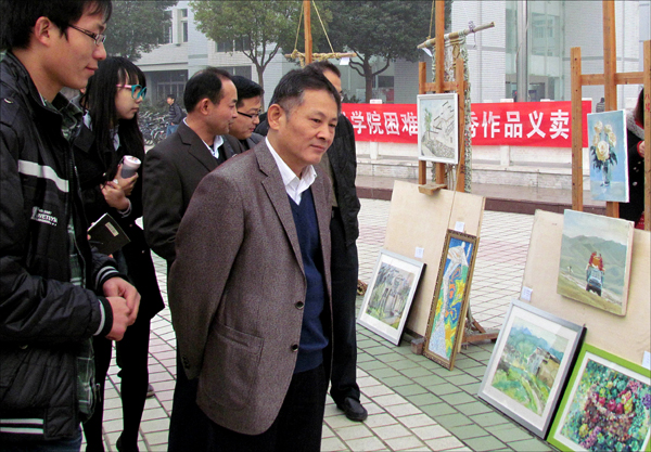 在拥挤的人潮中,一个熟悉地身影引起记者的注意,朱士群院长前往每一幅作品前驻足观赏,环绕观看一圈后,他最终以300元的价格买了《村路》这幅作品,当记者准备采访他时,他却报以微笑然后摆手示意,静静地离开了义卖的现场。