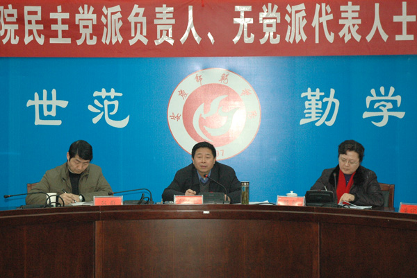 党委副书记、纪委书记殷红同志主持座谈会。她指出,何书记的即席讲话对全校民主党派、无党派人士的各项工作给予了充分肯定,特别是对统战成员以良好的参政议政形象博得了良好的社会声誉给予了高度的评价,让我们深受鼓舞。她要求全校各民主党派、无党派人士一定要认真落实好何书记的重要讲话精神,在党委的领导下,更好地发挥我们自己的积极性、主动性和创造性,为学校第五次党代会提出的建设应用性突出、特色鲜明的高水平大学作出更大的成绩。她最后希望,全校统战成员在新的一年里,在校党委的领导下,围绕新的目标,站在新的起点上,继续与中国共产党同心、同向、同行,争取取得新的更大的成绩。