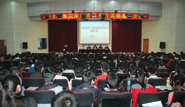 图书馆馆长董根明致欢迎词,并在开幕式后为全体员主讲了“图书馆形象与员工服务意识”的专题学术讲座。程先莲老师代表图书馆员工、10级法学一班的张青代表学生读者在开幕式上作了表态发言。图书馆副馆长汪健主持了开幕式。(文/图书馆 图/陈广 )