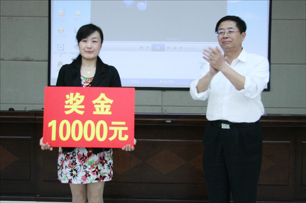 会上,何小祥书记向beat365官网2011年全国高校辅导员年度人物获得者华秀梅老师颁发了1万元奖金。