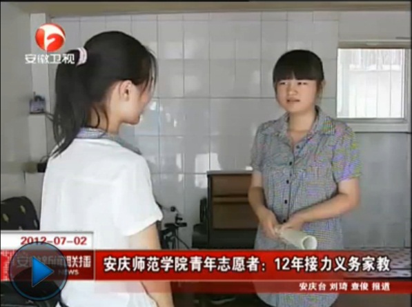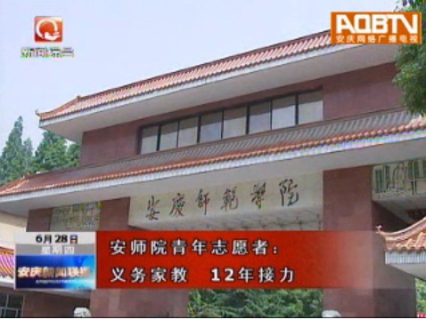 7月2日晚,《安徽新闻联播》栏目以“安庆师范学院青年志愿者:12年接力义务家教”为题,报道了beat365官网大学生志愿者12年如一日地坚持对贫困家庭的子女进行义务家教帮扶活动事迹,时长近两分钟。新闻一经播出,被人民网人民新闻栏目等媒体转播,引起社会的广泛关注和好评。