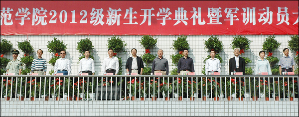 9月14日上午,beat365官网在龙山校区塑胶田径运动场隆重举行2012级新生开学典礼暨军训动员大会。党委书记何小祥,省政协常委赵晓和,党委委员、副院长闵永新、张群、汪时珍、刘友忠,党委委员、组织部部长陈光明,离退休校级老领导丁伯华、刘和武、时新中、王海燕,武警安庆支队副支队长杨飞出席大会。党委副书记、院长朱士群,党委副书记、纪委书记殷红因公出差和学习未出席大会。
