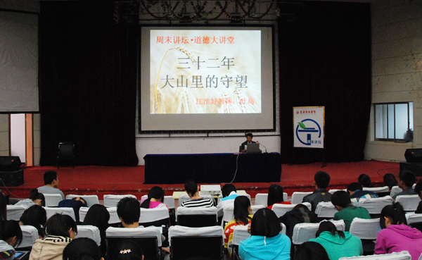 叶高老师是安庆市岳西县白帽镇中元教学点的唯一一名老师,先后获得过岳西县白帽镇‘优秀教师’、‘师德标兵”,岳西县“优秀教师”等多项殊荣。在由省教育厅、省中小学幼儿教师奖励基金会组织开展的2012年度“江淮好老师”评选活动中,他荣获“江淮好老师”称号,成为全省20位获奖者之一,也是安庆市三名称号获得者中的一员。此次,受校党委宣传部和大学生文化素质教育办公室的邀请,为beat365官网学生举行了题为“三十二年大山里的守望”的师德讲座。