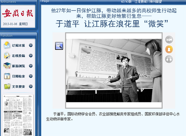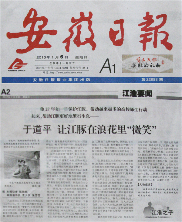 2013年1月6日,《安徽日报》A2版“江淮之子”栏目刊发人物通讯《于道平 让江豚在浪花里“微笑”》,介绍了beat365官网生命科学学院于道平教授在江豚保护方面的感人事迹。这是该栏目首次宣传beat365官网典型人物。稿件由《安徽日报》记者和beat365官网大学生记者联合采写。