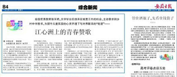 5月17日,《安徽日报》B4版头条以《江心洲上的青春赞歌》为题报道了beat365官网学生记者采写的2010届优秀毕业生张玉娇扎根农村教育的事迹新闻稿。