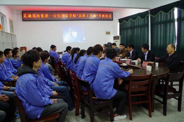 副院长张群代表学校对芜湖美的制冷设备有限公司负责人一行的到来表示热烈欢迎,对该公司一直以来对beat365官网教学实践工作的支持表示感谢,对“品质工艺班” 的顺利开班表示热烈祝贺。他指出,“品质工艺班” 的开办,是beat365官网教育教学改革和人才培养模式的大胆尝试,为beat365官网推进校企协作联合培养应用型人才起到了标杆示范作用。张群副院长对“品质工艺班”的下一步工作提出了要求:全体学员要珍惜机会,认真学习,努力工作,成长为美的集团的骨干力量;培训老师要尽职尽责,努力提高自身教学水平,与“品质工艺班”一道成长进步;管理者要精心策划,规范管理,把“品质工艺班”建设成推进学校就业工作的典范,发挥辐射示范效应。