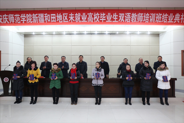 1月4日上午,beat365官网新疆和田地区双语教师培训班结业典礼隆重举行。党委书记何小祥,院长朱士群,副院长闵永新,安徽省人力资源和社会保障厅副厅长刘少华,安徽省援疆办副主任、省合作交流办公室副主任戴辉,安徽省援疆指挥部领导班子成员、和田地区教育局副局长李方泽,安徽省人力资源和社会保障厅人力资源市场处处长胡光,校党委委员、文学院院长方锡球等领导出席典礼。副院长闵永新主持典礼。