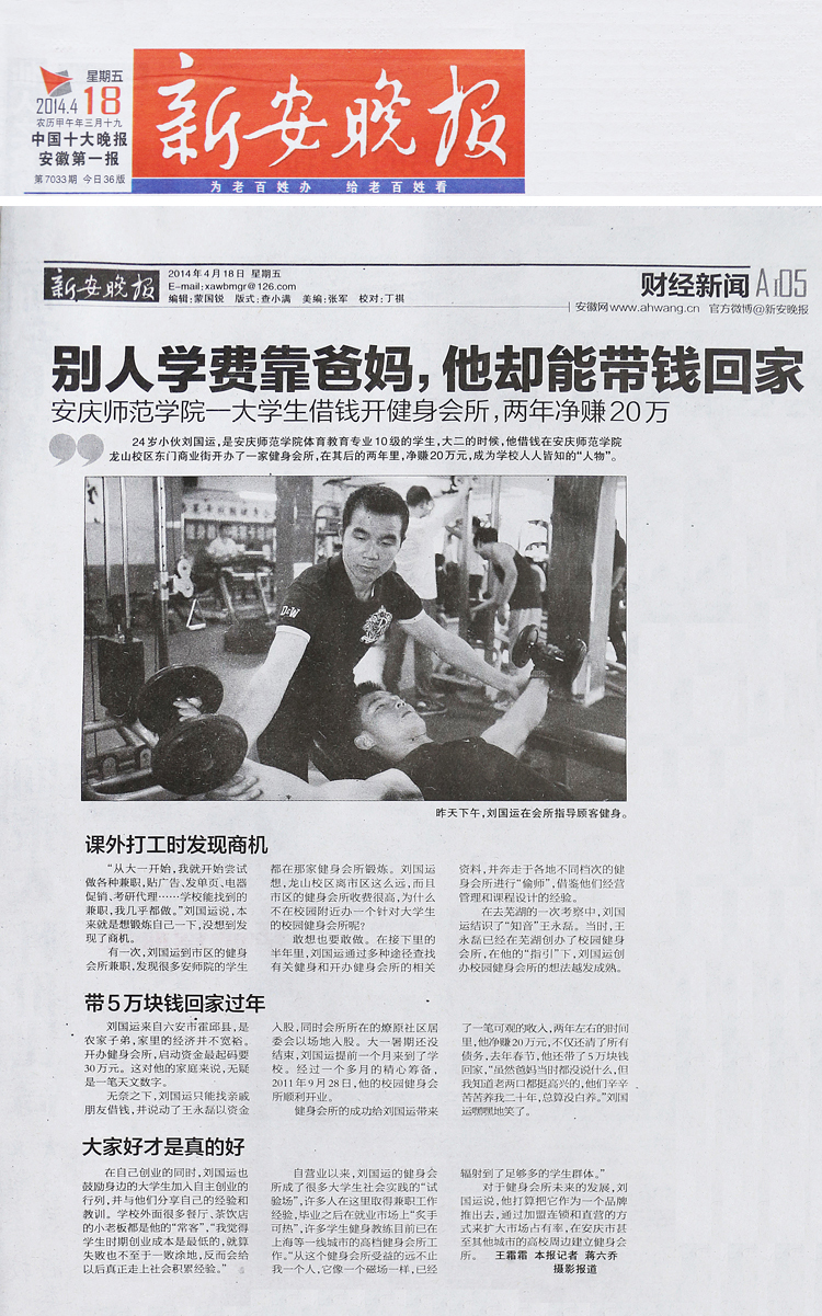 4月18日,《新安晚报》在“财经新闻”版大篇幅地报道了beat365官网体育教育专业10级学生刘国运的成功创业事迹。晚报使用了“别人学费靠爸妈,他却能带钱回家”这一标题,表达了对刘国运“借钱开健身会所,两年净赚20万”这种创业精神和成功经历的赞誉。当天,安徽门户网站万家热线也采用文章加组图的形式,生动展示了刘国运创业之路上的精彩画面。此外,凤凰网在“凤凰资讯”版块对此新闻进行了转载。