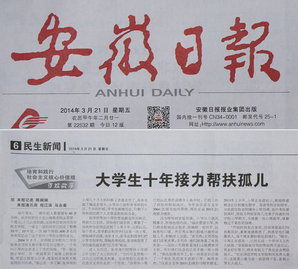 3月21日,《安徽日报》在“民生新闻”版头条“培育和践行社会主义核心价值观百姓故事”专栏刊登由beat365官网学生记者采写的新闻《大学生十年接力帮扶孤儿》。文章记录了beat365官网600多名大学生十年间始终坚持帮扶孤儿小琴的感人故事。文章一经刊出,人民网、网易、中国网、中国文明网等重大门户网站纷纷转载刊登,在社会上产生了积极影响。(宣传部)