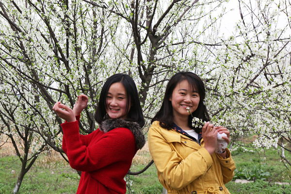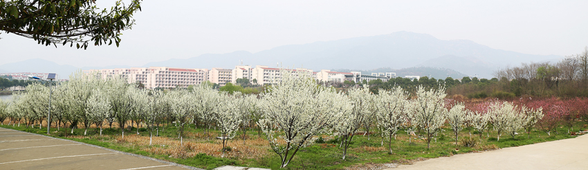 读书园边最醒目的莫过于文渊、文源、文溯、文津这4栋教学楼了,大学的大多时光是奔波在这4座教学楼的大小教室里,还有那些当初志同道合的研友们,那时我们奋斗的文源楼512教室,现在也全换成了稚嫩、陌生的面孔。教学楼跟安苑食堂隔着一片荒芜的草地,为了在第一时间抢到食堂的糖醋鱼和粉蒸肉,荒地上硬是被我们走出了一条小道。当时被我们戏称“北大荒”的荒地,如今早已是梨花、桃花盛开的桃梨园。左边是梨花的天下,白如雪的梨花,朵朵成簇,簇簇成枝,不是这和煦的春风吹过,真有种置身于银装素裹的冬雪世界里的感觉。右边则是一片粉色王国,桃树一层层,粉了半边天。春风吹过,落英缤纷,片片花瓣犹如桃花雨般洒落,颇有陶渊明笔下桃花源的意境。