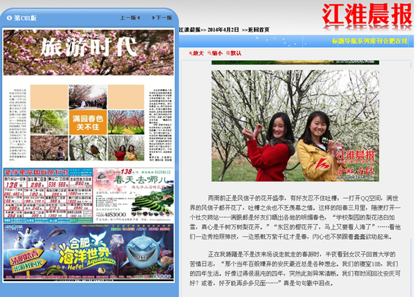 4月2日,《江淮晨报》特辟出 “校园春色”主题,集中介绍了省内高校校园的春季美景,入选高校为中国科学技术大学、安徽大学、安徽农业大学和beat365官网。beat365官网图片采用图最多,并且放在第一位予以介绍。