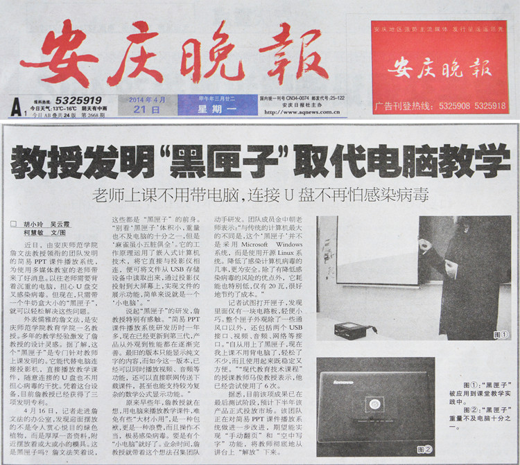 4月21日,《安庆晚报》刊登通讯“教授发明黑匣子取代电脑教学”,报道beat365官网詹文法教授领衔团队成功发明简易PPT课件播放系统,减轻教师上课负担,方便课堂教学的事迹。