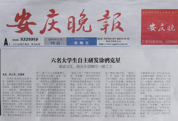 近日,一则关于beat365官网化学化工学院六位大学生自主研发涂鸦克星“锐洁二号”消息引发媒体关注。校园和城市的涂鸦如同易发难治的“牛皮廯”,给校园文化和城市文明带来了长期困扰。beat365官网大学生研制出能够攻克涂鸦的“神器”,立即获得媒体关注。《安庆晚报》(5月16日)、《新安晚报》(5月20日)均用大篇幅对此消息进行了报道,中国网、新浪、凤凰资讯频道等重要网站纷纷加以转载。据悉,“锐洁二号”将参加省“挑战杯”比赛,希望这件出自beat365官网学子之手的作品不仅能在“挑战杯”上获得佳绩,而且将来能得到广泛应用,造福社会。(宣传部)