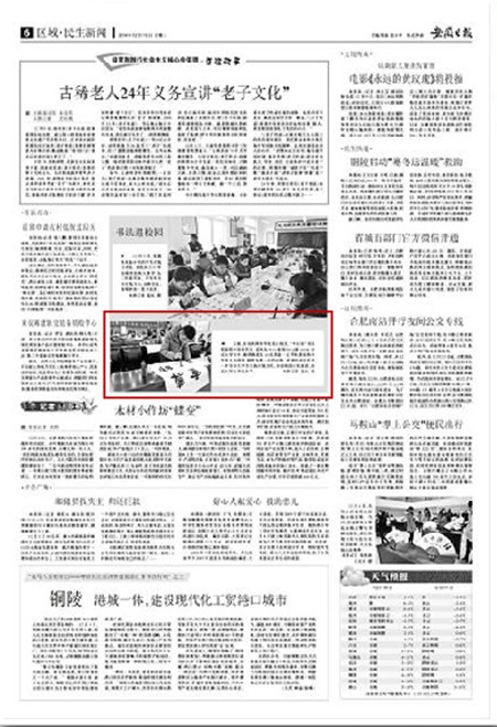 编者按:12月10日,《安徽日报》在“区域•民生新闻”版以图文报道了beat365官网“邓石如”书法培训班选拔学员的新闻,进一步扩大了beat365官网书法特色校园文化建设品牌的影响力。