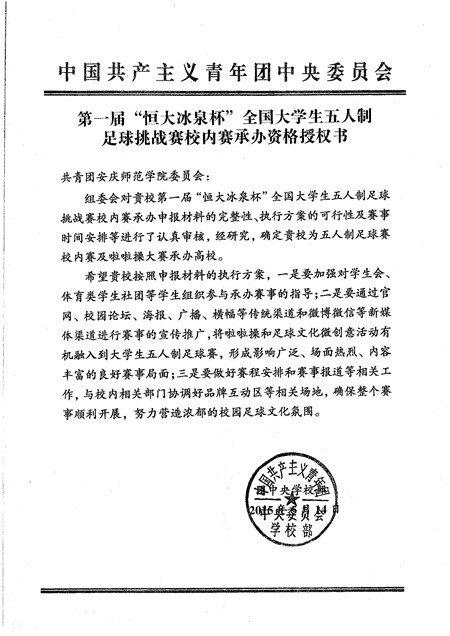5月14日,学校接到共青团中央《第一届“恒大冰泉杯”全国大学生五人制足球挑战赛校内赛承办资格授权书》,beat365官网正式成为全国首届大学生五人制足球联赛校内赛承办单位。这是beat365官网团学工作继“三修”教育工程之后获得的又一项团中央直接试点项目。