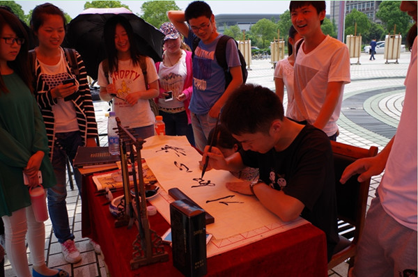 在展出现场,书法班的同学还现场进行书写表演,在展示书写实力的同时,将现场创作的作品赠送给前来参观的同学。学员朱传路现场创作一幅“博学而笃志,切问而静思”复旦大学校训的书法作品赠送给来自数学与计算科学学院的王雯慧,作为考研学子,她的梦想是进入复旦大学深造。“校训是对我最好的激励!” 王雯慧拿着校训作品说道。