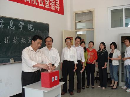 四川汶川发生强烈地震,灾害损失十分严重,造成了重大人员伤亡。灾区人民的安危牵动着计算机与信息学院全体师生员工的心。5月15日下午,该院积极响应学校号召,组织教职工、学生为汶川地震灾区捐款。在院党总支书记方旭东、院长姚合生、副院长钱萌的带领下,广大教职工踊跃参加、慷慨解囊,共捐款7000余元,为灾区人民渡过难关、重建家园献出一片爱心。(计算机与信息学院)