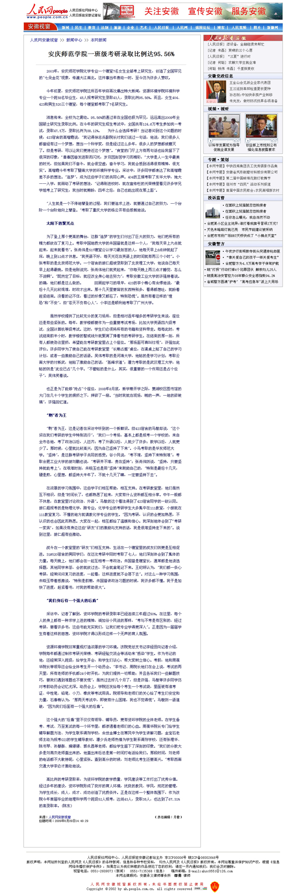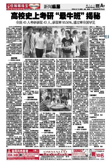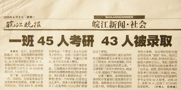 宣传部得知消息后,立即安排人手前往资环学院进行深入采访和挖掘,采写了《百年学府又爆出重大新闻:资环学院一班级45人报考研究生录取43人》,稿件随即被新华网、中安在线等媒体刊登,在社会上引起强烈反响。人民网、中国网、中国研究生招生网、中国考研网、国家教育信息网等媒体纷纷予以全文转载,新安晚报、江淮晨报、皖江晚报、安庆晚报等报刊也派遣记者前来采访,整版或者突出位置予以报道。目前,共有10多家重要媒体对此事进行了报道。(宣传部)