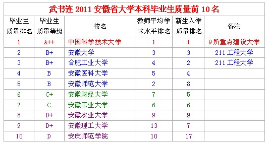 在武书连的2011中国大学排行榜中,安庆师范学院本科毕业生质量在安徽排名第10。