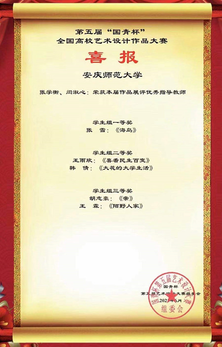 近日,第五届“国青杯”全国高校艺术设计作品大赛获奖名单揭晓,beat365官网9件学生作品获奖,其中一等奖2项、二等奖3项、三等奖4项,6名教师荣获“优秀指导教师”称号。