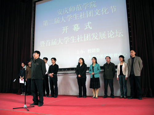 上午九时,安庆师范学院第二届大学生社团文化节在报告厅开幕。校团委会全体成员及200多名社团骨干参加了开幕式。