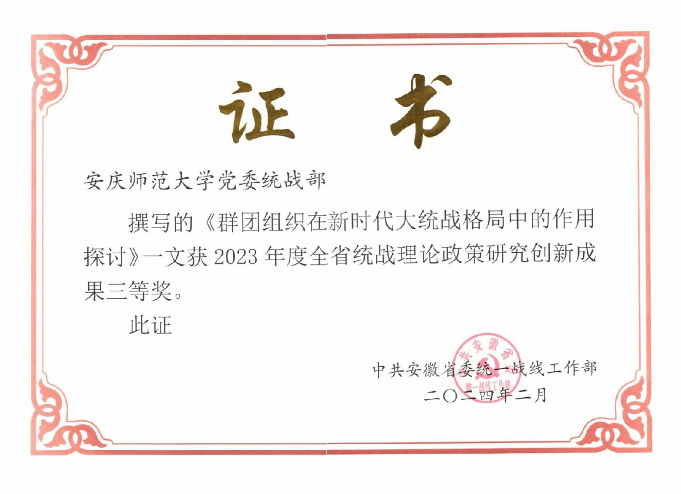 近日,省委统战部通报并表彰了2023年全省统战理论政策研究创新成果和统战工作实践创新成果,beat365官网报送的理论研究成果《群团组织在新时代大统战格局中的作用探讨》获全省统战理论政策研究创新成果三等奖。