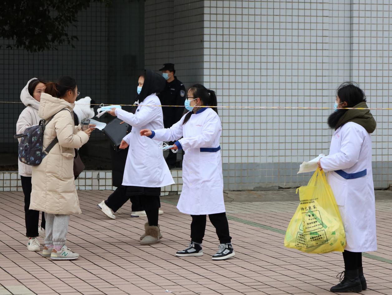 考点四周拉着警戒线,工作人员在考场内外实时巡逻,维持考试秩序;校医院医护工作者及120救护车在考点待命,随时应对处理现场突发情况;学校疫情防控指挥部办公室启用备用口罩,免费分发给现场考生……为了确保考试顺利进行,学校各方全力以赴为考生“保驾护航”,近600名考务人员、监考老师、安全保卫及后勤服务人员全程参与考试各方面工作,保障师生安全和考试安全。