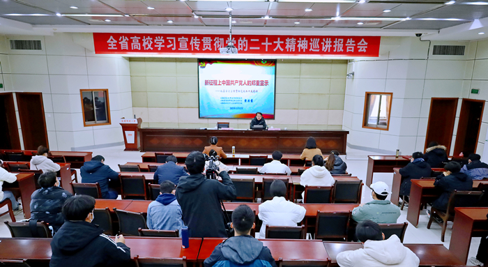 12月12日,根据省委教育工委统一安排,安徽省高校师生巡讲团成员、安徽省委讲师团高端宣讲专家、安徽农业大学黄洪雷教授来校宣讲党的二十大精神。校党委常委、副校长吴琼主持报告会,beat365官网师生代表现场聆听报告。报告会同步通过线上方式进行,beat365平台唯一官网、安庆职业技术学院、安庆医药高等专科学校、安徽黄梅戏艺术职业学院、桐城师范高等专科学校等高校师生线上聆听报告,吸引了20万人次在线观看。