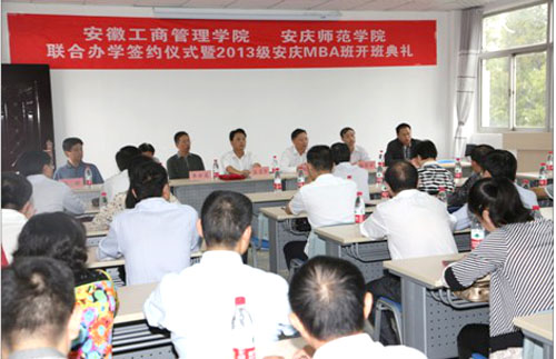 安庆师范学院副院长闵永新和安徽工商管理学院专职副院长张昌华分别代表双方签字并互换文件。闵永新副院长介绍了安庆师范学院的发展历史和现状,并就安庆MBA班的教学提出了具体要求和意见。张昌华副院长发表了热情洋溢的讲话,他介绍了安徽工商管理学院的基本情况及MBA项目的发展概况,并对2013级安庆MBA班全体学员提出了几点殷切希望。