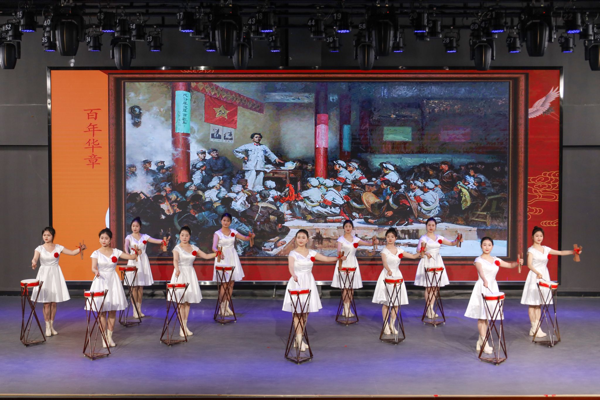 “汹涌澎湃的历史进程从哪里开始,力挽狂澜的时代先锋就从哪里出场。在中华民族跌入黑暗深渊、面临何去何从的重大关头,中国共产党登上历史舞台,犹如划破沉沉夜霾的凌厉闪电。百年辉煌党史,镌刻着共产党人坚如磐石的革命信仰,印证着中国共产党人治国理政的智慧。“红旗招展惊风雨,天翻地覆慨而慷,来自黄梅剧艺术学院的11名学生用黄梅大鼓《百年华章》,讴歌了中国共产党百余年来的奋斗历史,唱响了新时代、新征程上的复兴梦想。