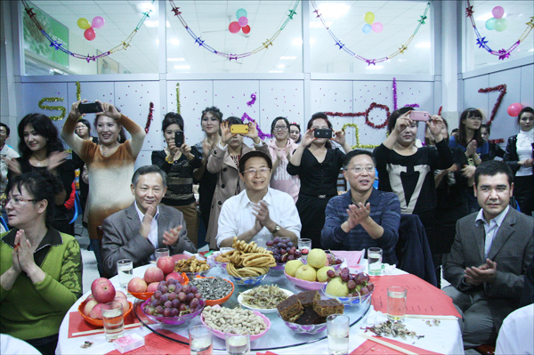 为了这个节日,新疆班学员自三天前就开始准备了,他们一起布置晚会场地,贴彩条,挂气球……。早晨6点多钟,他们就起了床,女生穿上了民族服装“艾特莱丝裙”,戴上鲜艳的“花帽”,男生也穿上了笔挺的西装。