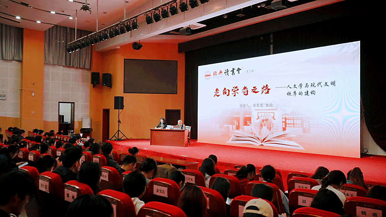 陈文忠以《走向学者之路——人文学与现代文明秩序的建构》为题从“大学生需要读什么书”“如何成为一个读书人”两方面入手,论述了经典著作对于青年学子成长成才所起到的重要作用,详细介绍了人文学者的学术特征、文化使命以及成为人文学者的“五部曲”。他表示,问题是哲学的中心,论证是哲学的精髓,并引用典型案例重点强调了思辨、论证的重要意义。