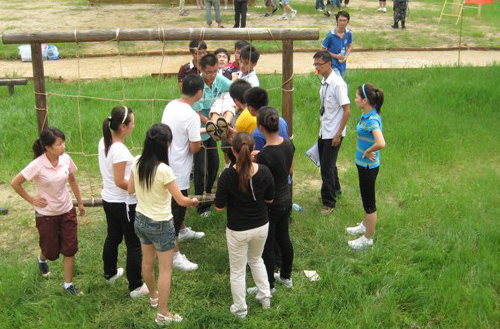 生死电网训练:假设所有队员必须通过电网才能逃生,电网由纵横线交错组成一个一个方框,共四排,最底排允许队员面朝上或面朝上通过,但上面三排要求通过队员必须面朝上通过。每一个框只限一名队员通过,任何一个队员的衣服或者身体的任何一个部分(包括头发)一旦触到网线,那么所有队员必须全部返回,重新过网。在整个训练过程中不允许队员进行交谈。