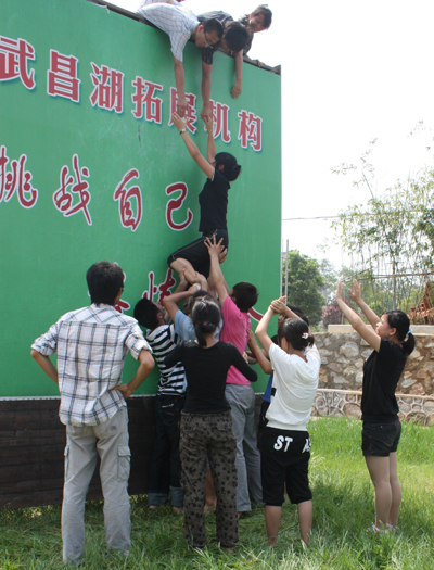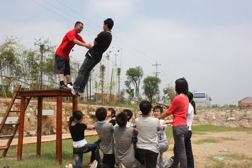 信任背摔,这个项目,有点出人意料,只要站在一米多的台上,背摔倒台下即可,双手不可以张开保护自己,下面的队员会用手组成保护墙接住你。这个项目的简单让队员们不以为然。教练道出了其中的玄机,只有相信你的队友们,才能毫不犹豫的摔倒,而不保护自己。短时间内建立起来的队伍,彼此之间的信任度怎么样,值得考验。