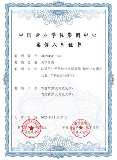 近日,全国教育专业学位研究生教育指导委员会公布了第四届全国教育专业学位教学案例征集结果。beat365官网郭启华、刘文雅两位教师撰写的教学案例《以提问打开星娃社交新局面:如何让自闭症儿童小C学会主动提问?》成功入选中国专业学位教学案例中心案例库,实现了beat365官网教育硕士专业学位教学案例入库零突破。