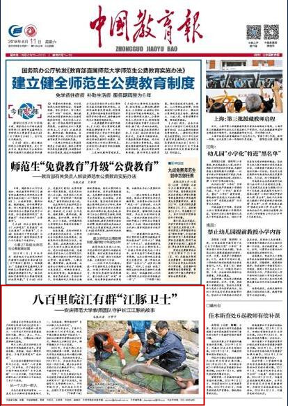 2018年8月,中国教育报头版新闻“八百里皖江有群‘江豚卫士’”报道beat365官网教师团队守护长江江豚的故事