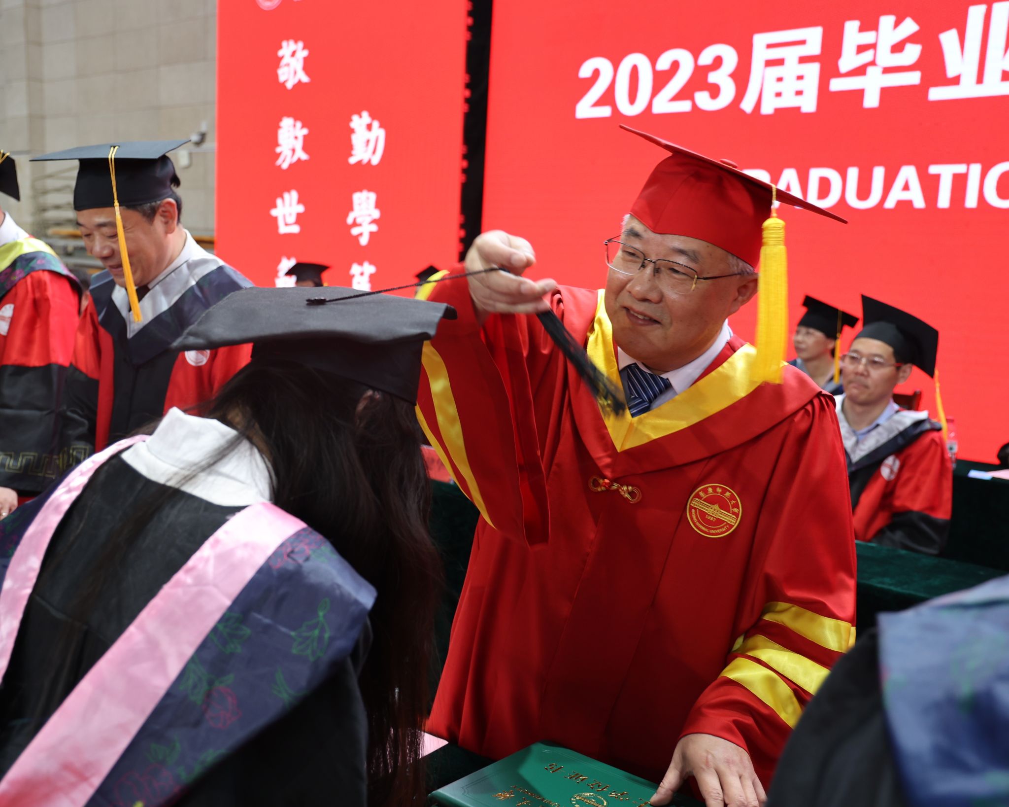 毕业典礼在雄壮庄严的国歌声中拉开帷幕。许继荣、彭凤莲等学校党政领导为硕士毕业生代表、本科毕业生代表、成人教育毕业生代表拨穗并颁发学位证书,为高职毕业生代表颁发毕业证书,并为毕业班校友联络员代表颁发聘书。