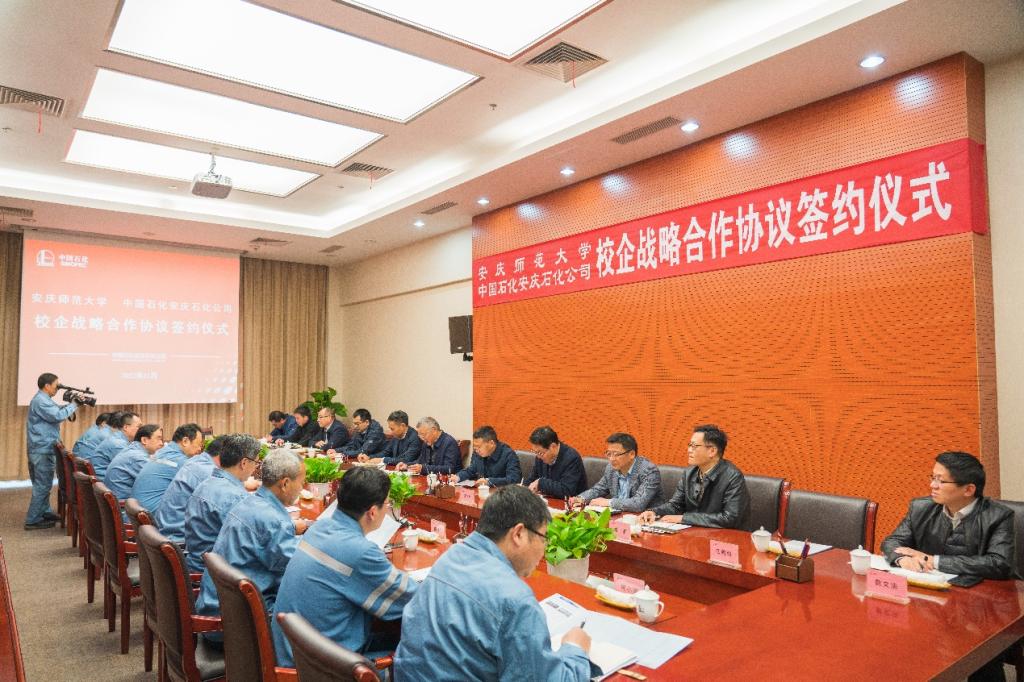 汪时珍介绍了学校在科学研究、平台建设和校市合作等方面成果。他表示,学校与安庆石化的合作有着广阔的空间,对人才的协同培养、科研的协同攻关、平台的协同共建以及高峰学科与博士点立项建设学科水平的提升均将产生积极而深远的影响,希望学校各部门各学院要高度重视,积极主动作为,在校企层次、二级部门层次、项目团队层次、专家教授层次开展多维度多层次全面深入合作,形成 “千帆竞发”的良好态势。