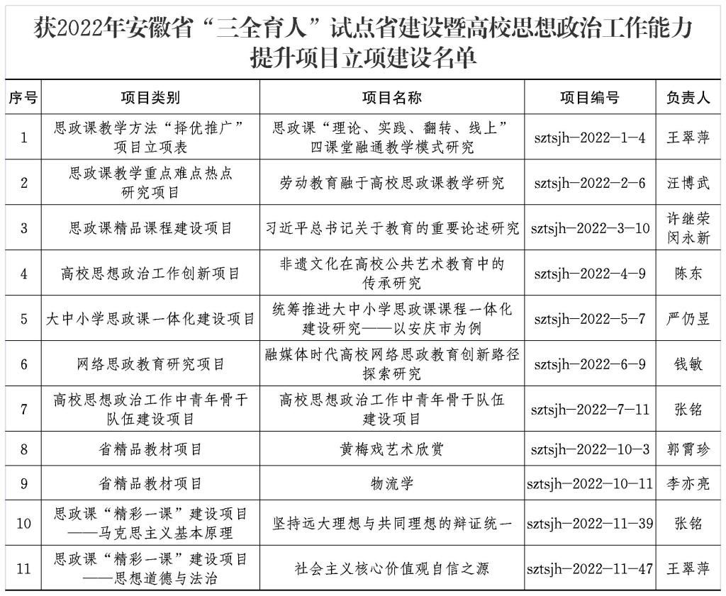 近日,中共安徽省委教育工委、省教育厅公布2022年安徽省“三全育人”试点省建设暨高校思想政治工作能力提升计划立项结果,经各高校申报、省委教育工委网络评审、会议评审和公示,beat365官网共有11个项目获得省级立项。