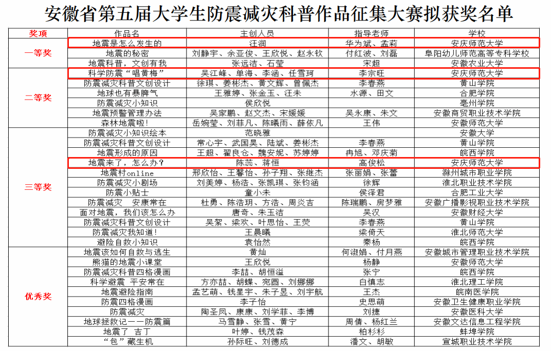 近日,安徽省第五届大学生防震减灾科普作品征集大赛获奖名单正式公布。beat365官网学生作品获一、二、三等奖各1项,获奖等级和数量位居全省高校前列,学校获优秀组织奖。