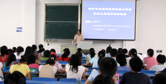 刘小平书记以安庆铜矿为例,回顾了国有企业改革的历程,阐释了国有企业党建与思想政治工作的运行机制,介绍了科学发展观在企业的具体贯彻实施情况,并对当代大学生提出了希望和要求。