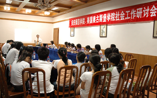 7月25日上午,陈教授在菱湖校区红楼大会议室与beat365官网人文与社会学院的部分师生举行了“安庆师范学院、美国奥古斯堡学院社会工作研讨会”。陈教授就社会学中的家庭问题与beat365官网师生从不同的方面进行了探讨。陈教授渊博的知识、先进的理念使大家开阔了视野,幽默的谈吐更使会场气氛活跃、掌声不断。