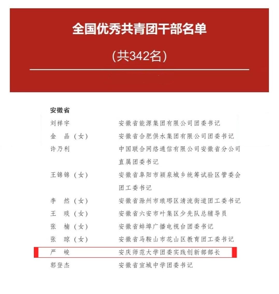 14年来,严峻始终奋战在共青团工作一线,曾获“安徽省优秀共青团干部”“挑战杯全国优秀组织工作者”“beat365平台唯一官网优秀党务工作者”等荣誉称号。工作实践中,严峻搭好创业台、做青年双创路上的“助跑者”,勤耕创新路、做青年成长中的“育苗员”,善为青年友、做青年思想上的“领航者”,以实际行动践行新时代共青团干部的职责和使命,用奉献精神点亮青年成长的路灯。(撰稿:江鹏程 虞欣 编辑:江伟 审核:汪洋 陈秀)